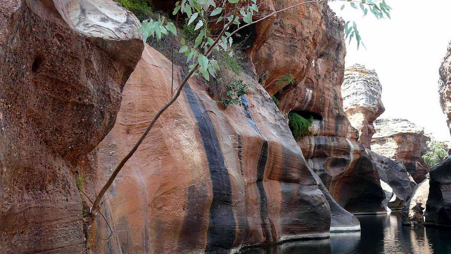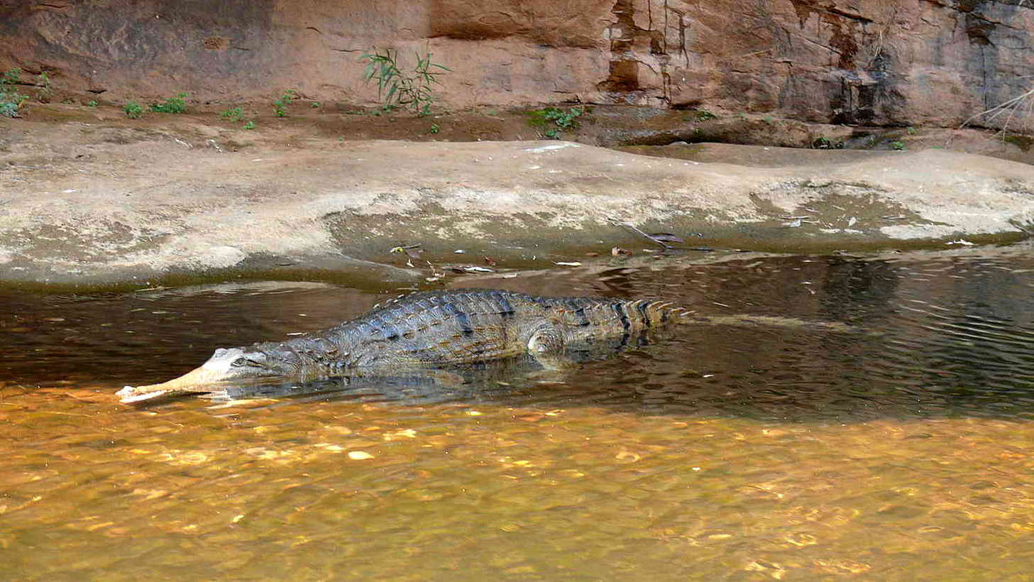 Das Boot kann wegen der schmalen Schlucht nicht gewendet werden. Teil- weise ist die Schlucht kaum breiter wie unser Boot, manchmal sind rechts und links nur 10 cm Platz. Daher wechselt unser Guide zum anderen Ende des Bootes, wo sich ein weiterer Elektromotor befindet und fährt uns langsam wieder zurück zum Ausgangspunkt.Auf dem Rückweg treffen wir auch wieder auf die Süßwasserkrokodile. Diese sind teilweise bis zu 2 m lang. Wir sind noch ganz fasziniert von der Cobbold Gorge, als wir am Ponton das Boot wieder verlassen. Die Bootsfahrt dauerte insgesamt 1 Std. Mit dem Bus geht es zurück zur Unterkunft. Auf dem Weg dorthin sehen wir noch einige Kängurus und durchqueren erneut den breiten, aber völlig trockenen Robertson River.