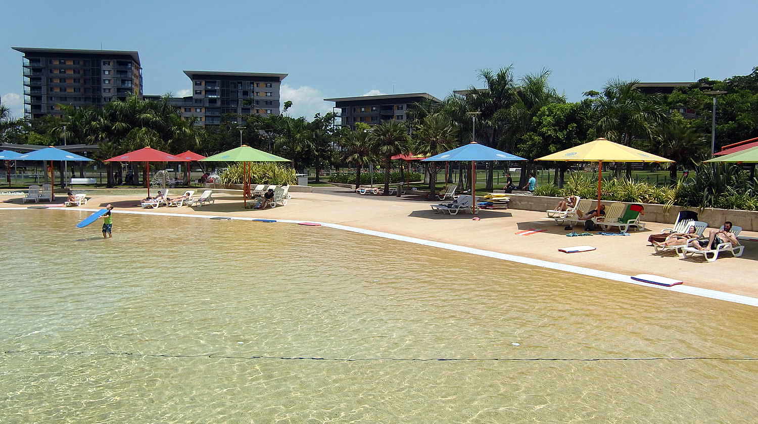 So bummeln wir weiter bis zur Waterfront. Hier finden wir den "The Coffee Club", ein nettes Restaurant mit einem umfangreichen Angebot an Speisen. Vom leckeren Frühstück bis zu einem guten Abendessen bekommt man hier alles. Ein großes Müsli mit Joghurt, Honig und Früchten hat es uns schließlich angetan. Dazu noch einen Cappuccino und es geht uns wieder richtig gut. Das Restaurant gefällt uns ausserordentlich gut. Nette Bedienung, schöne Karte (siehe Hinweis SONSTIGES)) für alle Gelegenheiten, relativ vernünftige Preise. Normalerweise bestellt man am Counter, bekommt eine Nummer und sucht sich dann einen Tisch aus. Das Essen wird anschließend dort serviert. Das Frühstück schmeckt uns ausgesprochen gut. Wir erfahren auch, dass der Coffee Club viele Restaurants in Australien besitzt. Im Internet finden wir bestimmt die Website, auf der wir nachsehen können, wo auf unserer Route wir wieder auf diesen Laden stoßen werden. Wir bummeln weiter, zunächst an der Waterfront entlang und zum Darwin Convention Center sowie einem Wellen- bad mit künstlichem Strand.