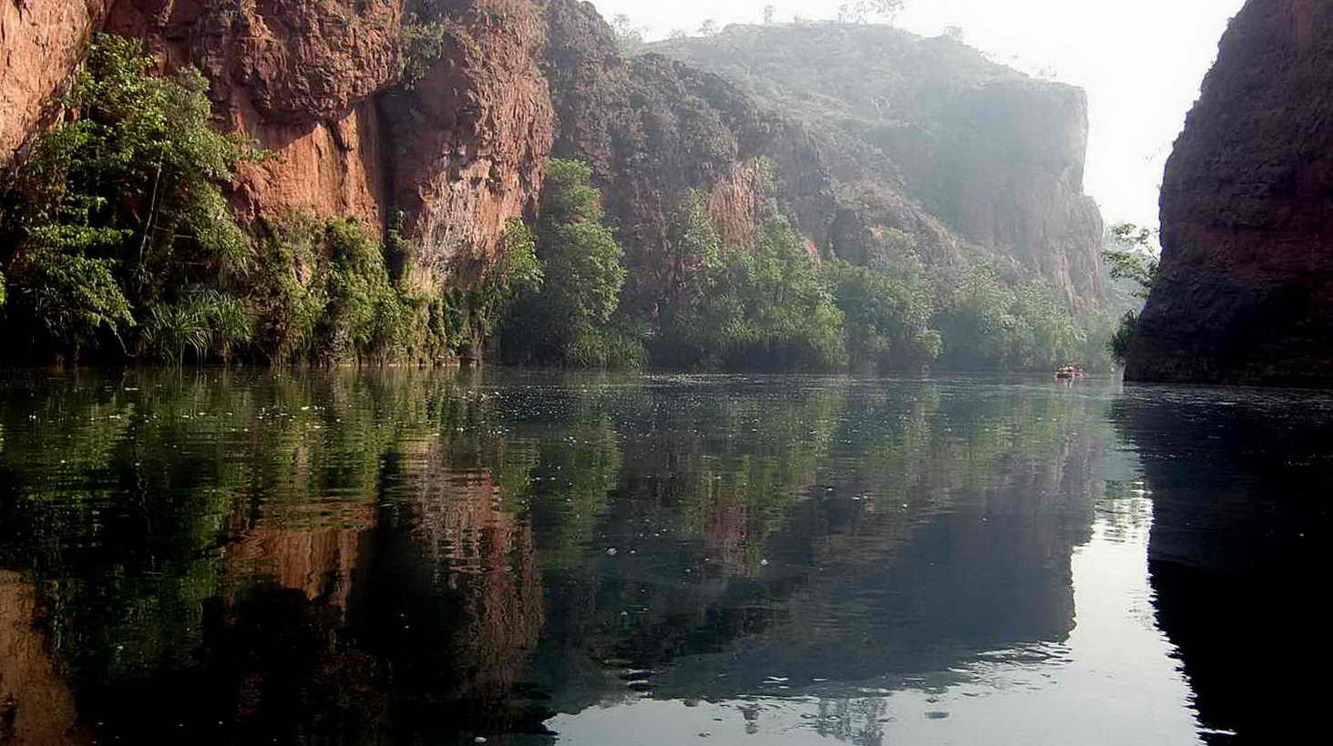 Nach etwa 1 Stunde und ca. 1,2 km erreichen wir die Indarri Falls, eine natürliche Barriere zwischen der Upper und der Middle Gorge. Diese Fälle sind etwa 2 Meter hoch und liegen in einer beeindruckenden Landschaft. Wir lassen uns dicht an den Fällen vorbeitreiben und fahren bis zum hintersten Ende der Middle Gorge. Hier kann man anlegen und schwimmen gehen, wenn man möchte. Das Wasser ist angenehm warm. Da uns aber nicht ganz klar ist, ob wir das Boot ohne Probleme verlassen und auch auch wieder besteigen können, bleiben wir einfach sitzen und genießen die Landschaft vom Boot aus.
