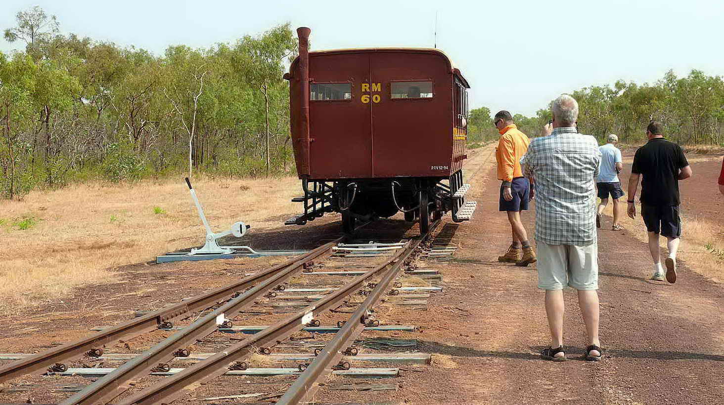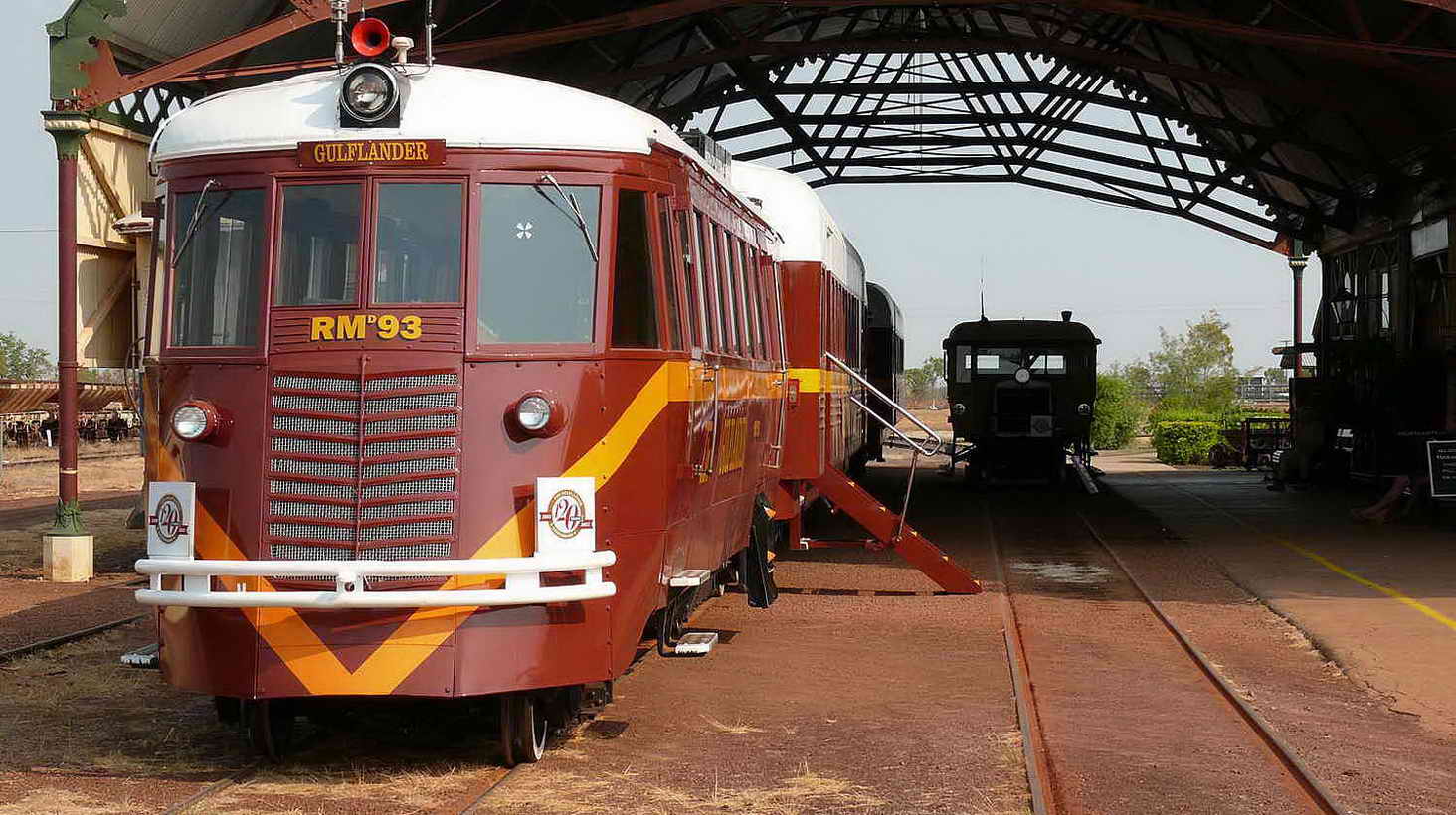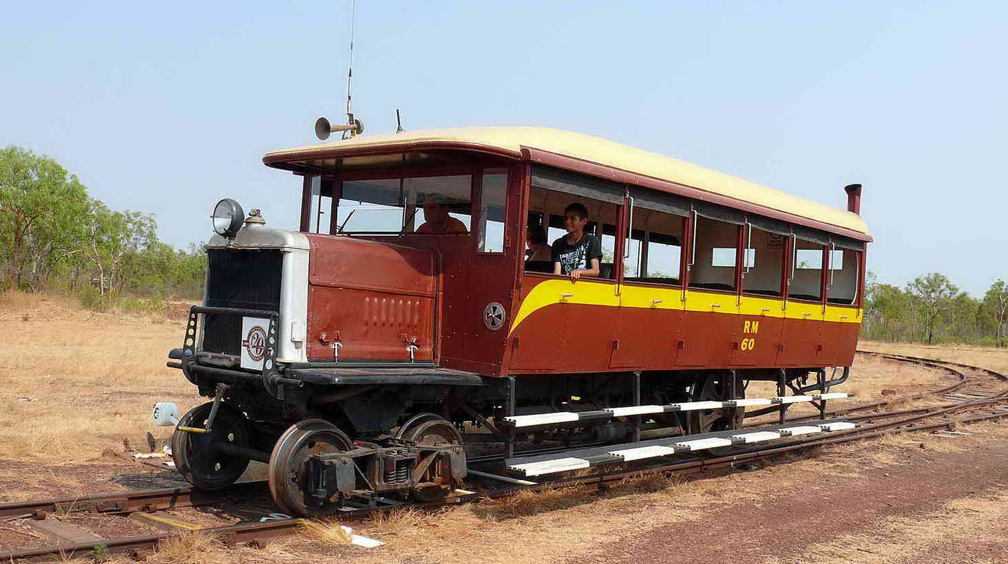 Anschließend fahren wir zu dem TakeAway, wo wir gestern schon etwas ge- gessen haben. Da unsere Zeit langsam knapp wird, die RM60-Fahrt steht an, kaufen wir einige Sandwiches und eine Sausage Roll sowie einige Getränke und fahren zum Bahnhof von Normanton. Das wird heute unser Frühstück sein. Mit unseren Fressalien gehen wir Richtung Bahnsteig. Zu unserer Über- raschung und Freude steht dort schon der Triebwagen RM60, mit dem wir um 9 Uhr 30 eine 40- minütige Fahrt unternehmen wollen. Es ist jetzt 9 Uhr und wir verspeisen schnell noch unsere Sandwiches. Danach drehe ich noch einige Szenen und schieße auch noch einige Fotos. Kurz vor der Abfahrt des Zuges kaufen wir 2 Tickets zum Preis von zusammen 50 AU$. Mit 4 weiteren Mit- reisenden besteigen wir um Punkt 9 Uhr 30 den kleinen Triebwagen, der wirklich kurios aussieht und aus dem Jahr 1931 stammt. Kurz zuvor hatte der Triebwagenführer mit nur einer Kurbelumdrehung die Maschine angeworfen. Langsam setzt sich die Bahn in Bewegung.