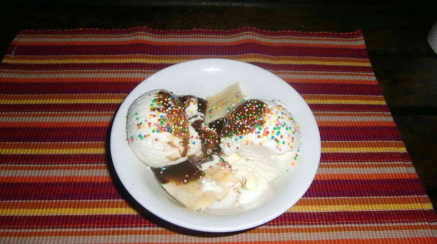 So dürfen wir auch als Erste zur Essensausgabe. Heute gibt es : eine kleine Pizza, 2 knallrote Würstchen und dazu noch 2 verschiedene Salate. Trotzdem schmeckt uns das Essen gut und wir dürfen uns sogar Nachschlag holen. Als Nachtisch werden 2 verschieden Arten Götterspeise serviert , die wir auch pro- bieren. Auch Puffreisplätzchen mit Schokoladengeschmack steht noch zur Auswahl. Wir bekommen zusätzlich jeder 2 Kugeln Eis auf einer halbierter Banane mit Schoko- ladensoße und bunten Streuseln. Ein köstliches Dinner, wir haben uns sehr amüsiert, fast wie Kindergeburtstag. Wir genehmigen uns noch ein Glas Lambrusco und kehren dann schmunzelnd auf unser Zimmer zurück.