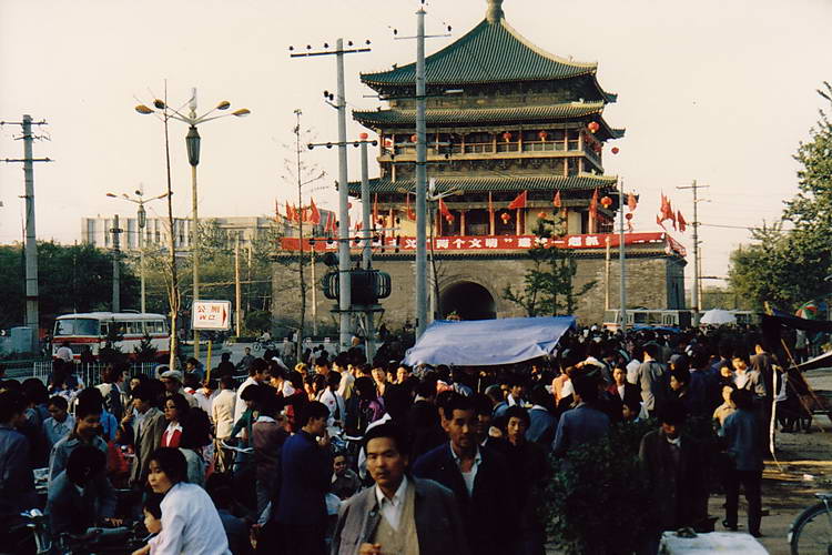 Neben dem Glockenturm steht der Trommelturm. Ich sah auf einmal vor uns mehrere junge Leute, die aus einem großen Pappkarton viel roten Stoff oder Fahnen rausnehmen wollten. Plötzlich sahen sie dicht vor sich Doris. Der Schreck fuhr ihnen in die Glieder, sie stopften alles in Windeseile in den Karton zurück und verschwanden im Gedränge. Ich habe mich köstlich amüsiert.
