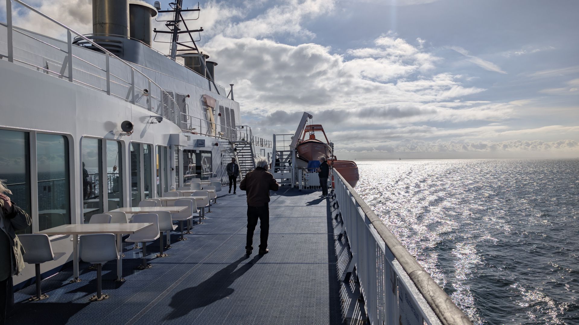 Noch ist die Fähre nicht am Anleger und wir dürfen den Bus verlassen um uns ein wenig umzusehen. Am ca. 2 Km entfernten Warnemünde Cruise Center entdecke ich die Aidamar. Auf diesem Kreuzfahrtschiff habe ich 2024 die letzte gemeinsame Reise mit Elke unternommen (5 Tage Ostsee). Kurz darauf erreicht die Fähre „Berlin“ der Reederei Scandlines den Hafen von Warnemünde und legt einige Minuten später am Kai an. Es ist eine von 6 so genannten Hybridfähren der Reederei. Das spezielle Rotorsegel oben auf dem Schiff erzeugt, ähnlich wie bei Flugzeugen der Auftrieb, hier einen Vorwärtsschub und hilft Energie zu sparen. Zunächst fahren alle Fahrzeuge von Bord, dann dürfen wir mit unserem Bus an Bord fahren. Während der Fährfahrt müssen wir den Bus verlassen und uns auf den Passagierdecks aufhalten, denn das Autodeck wird solange geschlossen.