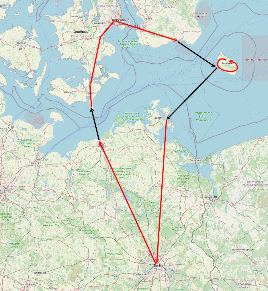 Auf der Hinfahrt sind 2 Fährfarten vorgesehen sowie die Überquerung des Öresund auf der riesigen Öresundbrücke. Dann folgen 3 Nächte auf der zu Dänemark gehörenden Insel Bornholm mit Besichtigungen der wichtigsten Sehenswürdigkeiten der Insel. Am letzten Tag fahren wir dann mit der Fähre nach Sassnitz auf Rügen, wo wir noch den vor ein paar Jahren erbauten Skywalk mit Ausblick auf die Kreidefelsen besuchen. Noch am gleichen Tag endet die Reise wieder in Berlin.
