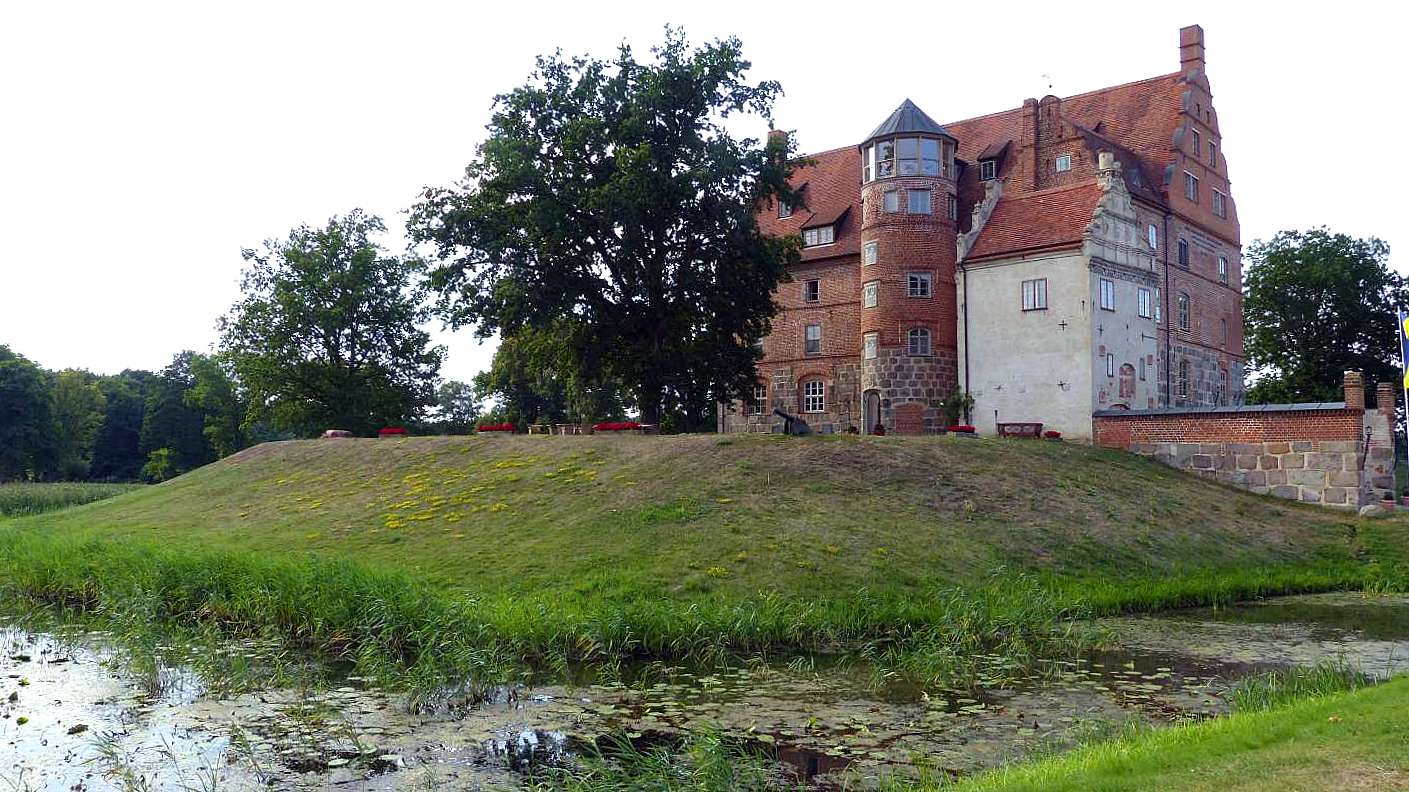 Die Landschaft, durch die wir jetzt fahren, ist doch etwas abwechslungsreicher als bisher. Wir sehen immer wieder Kraniche, viel Landwirtschaft und sie ist deutlich hügeliger als bisher. Die Strassen zum Schloss Ulrichshausen sind (von dieser Seite kommend) etwas abenteuerlich, viele kleine einspurige Strassen. Teile des Schlosses sind wesentlich älter als die bisher besuchten Schlösser, was man ihm auch ansieht. Es ist eines der bedeutendsten Renaissancebauwerke Mecklenburgs und liegt am Südufer des Ulrichshusener Sees auf einem Hügel. Teile vom nicht mehr vorhandenen Schloss wurden in die Fassade integriert. Noch immer scheint die Sonne. So lassen wir uns am See für einen Augenblick nieder und genießen die Landschaft und die ruhige Umgebung.