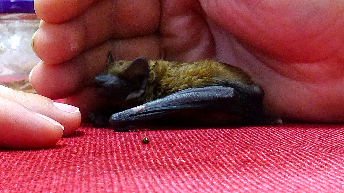 Gegen 20 Uhr zeigen uns die Besitzer der Pension Fledermaus eine junge Fledermaus (Großer Abendsegler), die bei ihnen abgegeben wurde. Sie wird von Hand gefüttern und krabelt in meine Hand und später auf meinem Hemd herum. Der Pensionsbesitzer erzählt den Anwesenden viel über Fledermäuse, Arten, Probleme, Haltung usw. Später versuchen wir noch Fledermäuse beim Abflug aus den Kästen zu sehen können aber nur eine entdecken. Unterstützt wird die Beobachtung von einem Messgerät zur Umsetzung der hochfrequenten Fledermaustöne, die diese kurz vor dem Abflug ausstossen. Wir setzen uns später noch zusammen und sehen uns Bilder von Gitti's letzen Urlaub an. Ich schreibe noch den Reisebericht und überspielen die Bilder des Tages. Gegen 23 Uhr krauchen wir dann ins Bett.