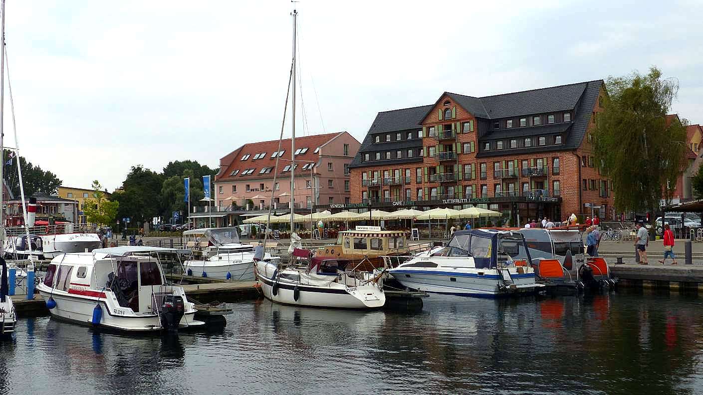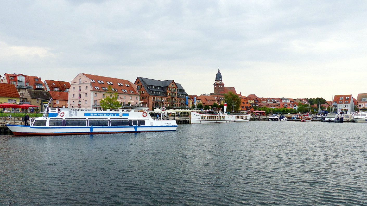 Der Regen hat inzwischen aufgehört und wir beschließen auf Grund der unsicheren Wetterlage nach Waren zu fahren. Hier kann man sich notfalls bei Regen besser unterstellen als im Wald. Mit dem Auto sind es nur wenige Minuten bis zum Hafen, wo wir noch einen freien Parkplatz bekommen. Die Stunde kostet hier 1€, was noch recht zivil ist. Wir bummeln zunächst am Hafen entlang und sind erstaunt, wie viele Menschen hier am Montag Vormittag schon unterwegs sind, aber es sind ja noch Ferien. Da der Hafen auch bei Wassersportlern sehr beliebt ist, wird er offensichtlich ständig erweitert, es wird schon wieder gebaut. Vor 20 Jahren, als wir hier das erste Mal waren, gab es nur wenige Hafenanlagen.