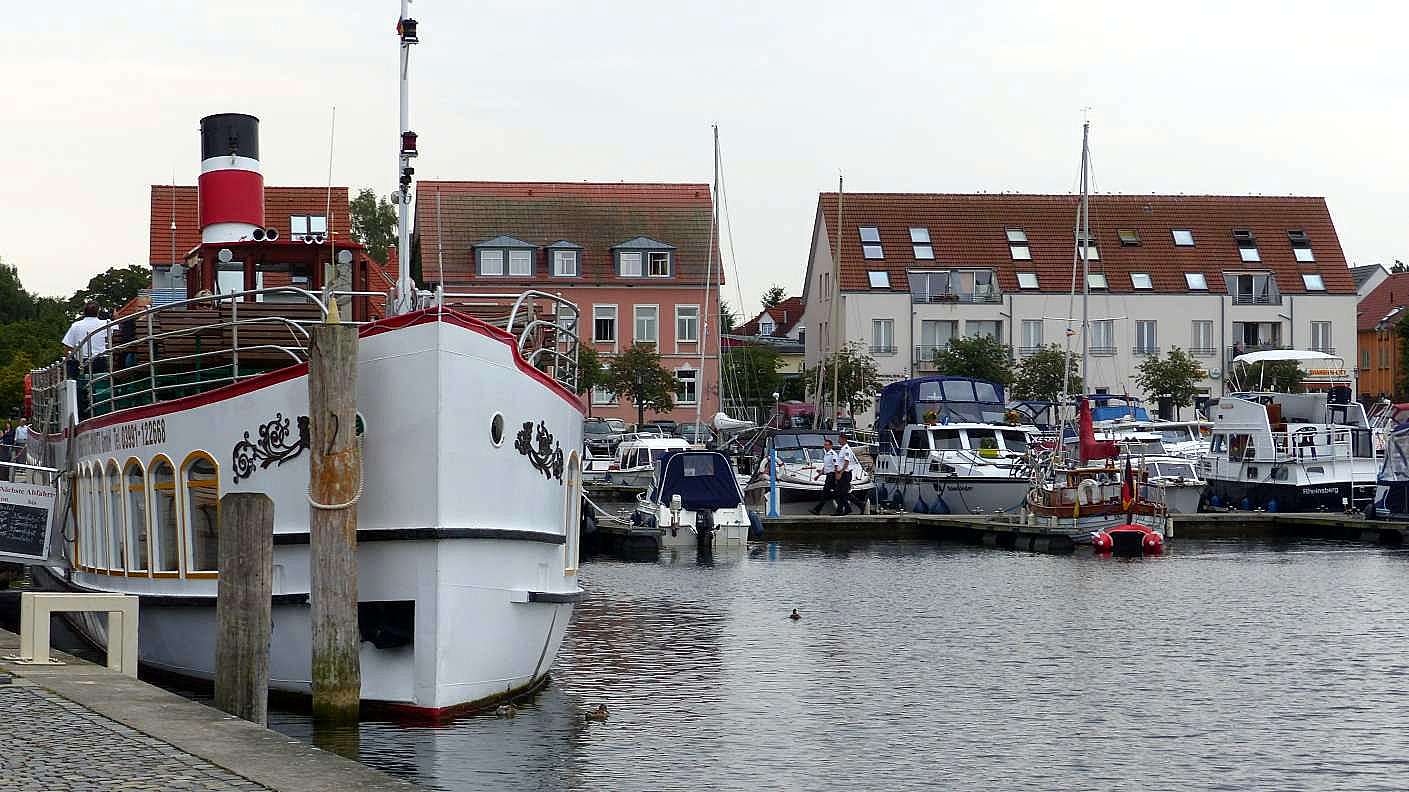 Wir bummeln zunächst direkt am Hafen entlang. 2 Fahrgastschiffe warten schon auf Touristen, die an einer der vielen Rundfahrten teilnehmen wollen. Der Hafen und die dahinterliegende Altstadt sind schön anzusehen, alles ist renoviert oder neu gebaut worden. Im Hafen fällt uns sofort nostalgische anmutende Salon-Dampfschiff "Europa" auf. Dieser Neubau von 2006 besitzt einen so genannten Hybridantrieb, d.h. der Fahrbetrieb kann mit einer originalen Dampfmaschine aus den Jahren 1910-15 mit 120 PS oder einem Elektromotor mit ebenfalls 120 PS durchgeführt werden. Die Zweikolbendampfmaschine wird mit einem Dieselbrenner betrieben. Ein schön anzusehender Dampfer.