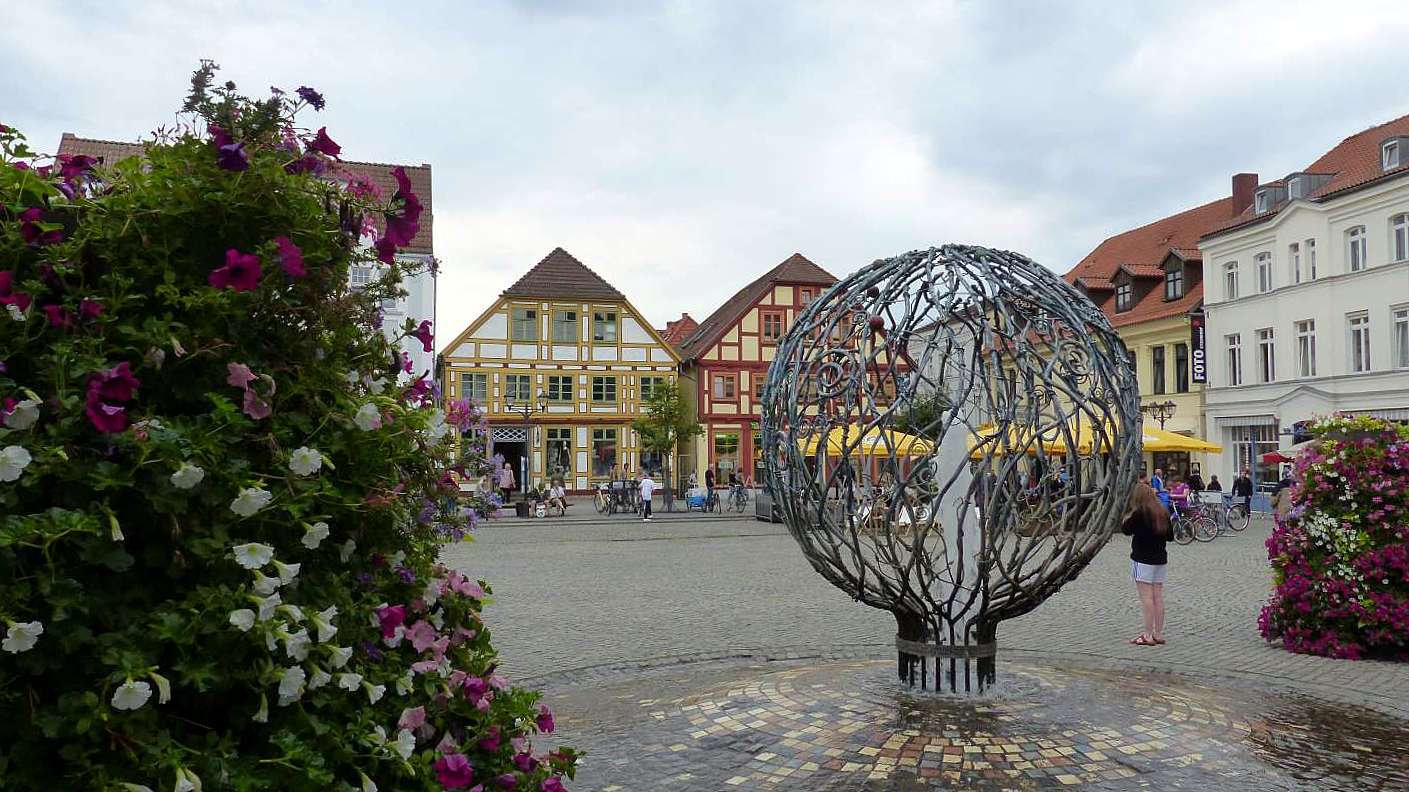 Als wir den Hafen umrundet haben fallen die ersten Regentropfen, hoffentlich bleibt es nur bei diesen wenigen Tropfen. Einige Minuten später ist es auch schon wieder vorbei und das war auch der letzte Regen für heute. Sehr auffälig am Hafen ist der Brunnen mit einer Schiffsschraube aus der das Wasser hervortritt. Wir verlassen den Hafenbereich und betreten über die Marktstr. die Altstadt von Waren.