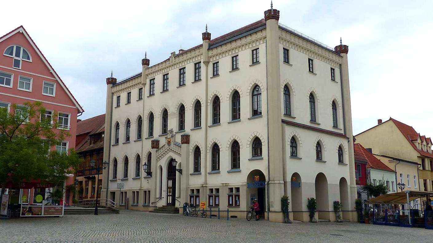 Wir erreichen den Neuen Markt von Waren. An diesem recht großzügig angelegten Platz stehen noch viele alte Fachwerkhäuser, u.a. das Haus "Neuer Markt 13". Das Haus ist eines der wenigen erhaltenen so genannten "Umgebindehäuser" von 1699, das nach dem letzten großen Stadtbrand gebaut wurde. Sehr beeindruckend ist auch das neue Rathausgebäude von 1797. Es wurde Mitte des 19. Jahrhunderts umgebaut und ist ein dreigeschossiger Bau in den Formen der Tudorgotik. Hier steht auch noch eine alte Ratswaage mit meterlangen Wägebalken.