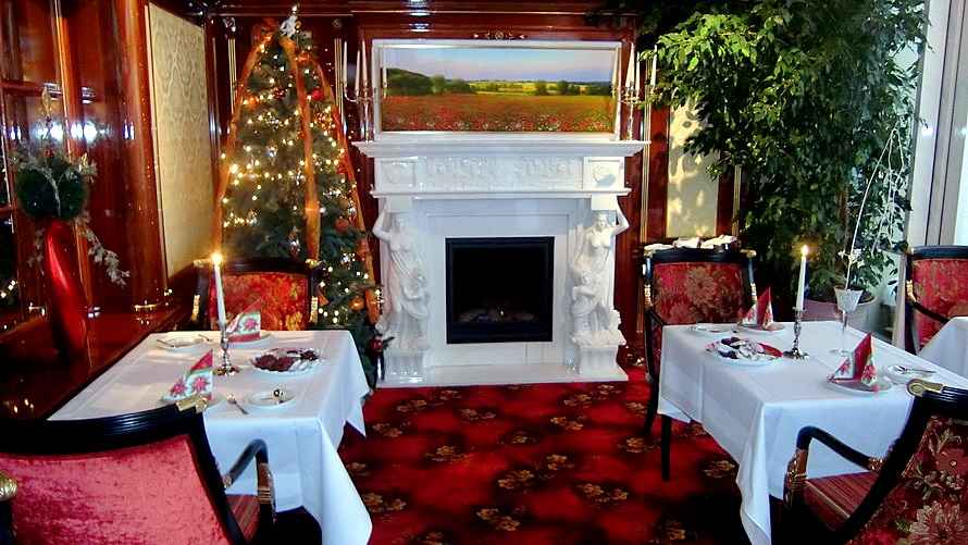 Nach dem Abendessen werfen wir noch einen Blick in das sehr schön gestal- tete Restaurant Gourmet. Wir dürfen, weil keine Gäste anwesend sind, uns das ganze Restaurant mit dem schönen Kamin und der tollen Ausstattung aus- giebig ansehen. Ein sehr schönes Restaurant mit entsprechend hohen Preisen.