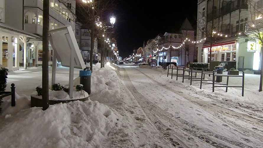 Da wir ziemlich „vollgefressen“ sind unternehmen wir noch einen Abend- spaziergang durch das verschneite Binz. Besonders die Büsche haben es uns angetan, überall sitzen auf den Spitzen kleine weiße Häubchen auf den Sträucher, aber auch die verschneiten Bäume und Häuser sehen sehr schön aus. Die Hauptstraße ist fast menschenleer aber sehr schön beleuchtet. Einige Häuser sind auch weihnachtlich geschmückt.