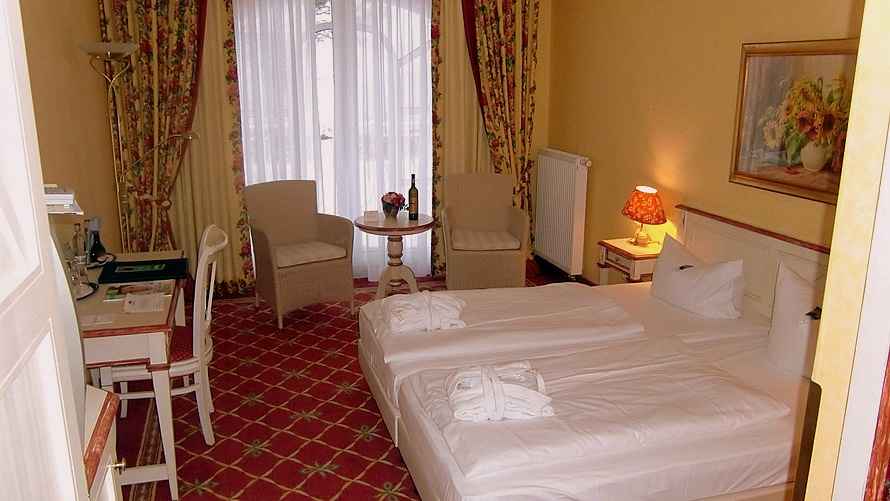 Direkt vor dem Hotel Rugard finden wir einen Parkplatz. Wir gehen erstmal mit kleinem Gepäck zur Rezeption und checken ein. Alles ist vorbereitet und so erhalten wir auch gleich die Schlüsselkarte für unser Zimmer 158 im Neubau des Hotel Rugard. Außerdem reservieren wir gleich noch 2 Plätze für den Sonntagnachmittag, geboten wird eine Feuerzangenbowle mit Gebäck und Lesung im Gourmet-Restaurant des Hauses. Ein Hotelangestellter kommt mit einer Transportkarre zu unserem Auto um so alles Gepäck auf einmal in unser Zimmer zu transportieren.