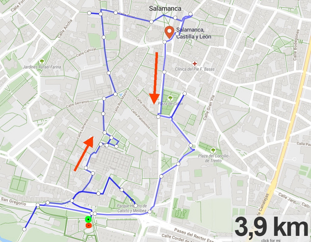 Über die Calle San Pablo bummeln wir weiter in Richtung des Treffpunkts für die Rückfahrt. Unterhalb der "Huerto de Calixto y Melibea" , an der alten Verteidigungsmauer "Muralla de Salamanca" aus dem 12.Jhdt., sucht sich Elke eine Stelle für eine Pause. Ihr Knie macht sie nach diesem Rundgang immer stärker bemerkbar. Ich laufe nochmal hoch in die Altstadt, denn der Eingang zu diesem Garten liegt hinter der vor uns aufragenden Stadtmauer.