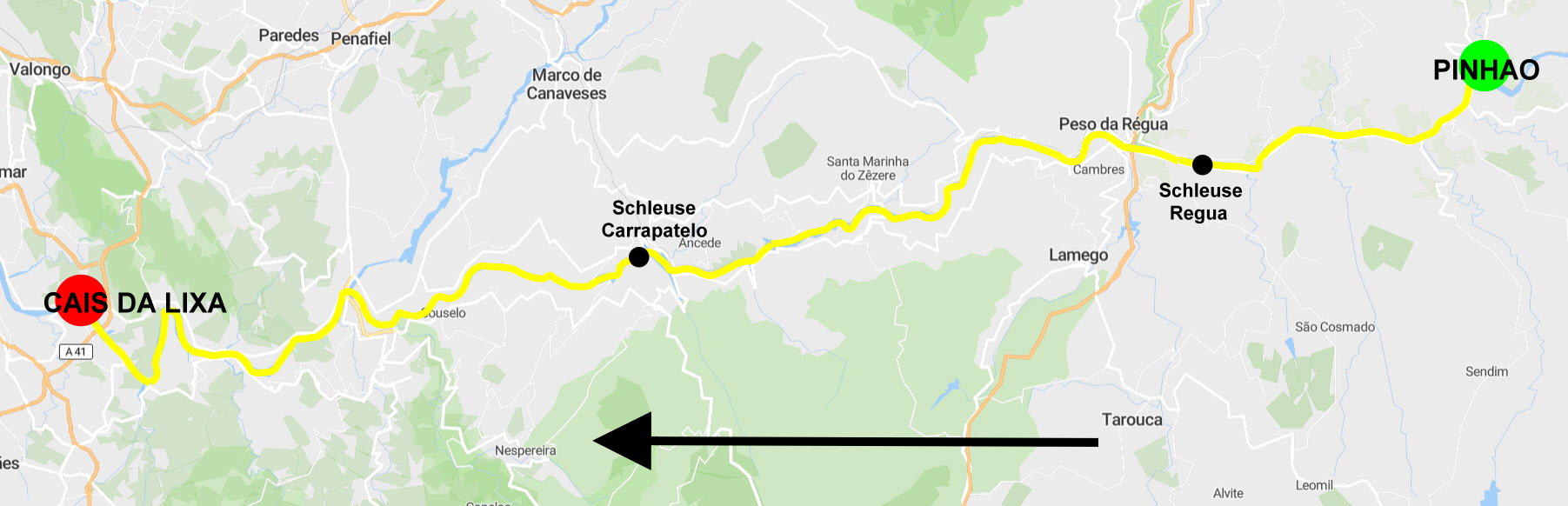 Für 6 Uhr 30 ist heute die Abfahrt in Pinhao geplant. Das das Schiff sehr ruhig abfährt und wir nichts mitbekommen stehen wir, wie gewohnt, um 7 Uhr auf. Noch vor dem Frühstück passieren wir kurz vor 8 Uhr die Schleuse von Regua. Diese Schleuse haben wir auf dem Hinweg durch einen Ausflug verpasst. Aber da sie mit 28 m deutlich kleiner als die beiden großen Schleusen ist und wir jetzt schon einige Schleusen passiert haben, ist sie ich mehr so interessant für uns. Kurz nach der Schleuse legen wir um 9 Uhr gegenüber von Regua an einem Kai an, wo die A-Rosa Alva betankt wird.