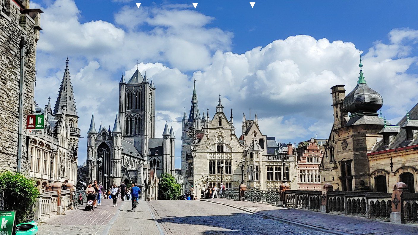 Was für eine Kulisse. Aber es geht noch weiter. Ein Blick nach links und wir sind erneut sowas von fasziniert. Vor uns liegt die so genannte Graslei mit den Gildenhäusern. Die Graslei ist ein Kai im historischen Stadtzentrum von Gent am rechten Ufer der Leie gelegen. Dieser und der gegenüberliegende Kai (Korenlei) waren Teil des mittelalterlichen Hafens und sind heute ein kultureller und touristischer Hotspot der Stadt. Aber schon seit dem 5. Jhdt. wurde hier Handel getrieben. Die meisten Häuser stammen aus dem Mittelalter, wurden aber im Laufe der Jahrhunderte baulich immer wieder verändert. Wir sind einfach nur fasziniert von diesem Anblick. Alle Fotoapparate und Smartphones sind jetzt im Dauereinsatz. Wir gehen von der Brücke hinunter auf den Kai Korenlei und bummeln an den gegenüberliegenden Häuserfassaden vorbei. Jede Fassade sieht anders aus und man könnte Stunden damit zubringen, sich die vielen Details anzusehen. Aber leider haben wir nicht soviel Zeit.