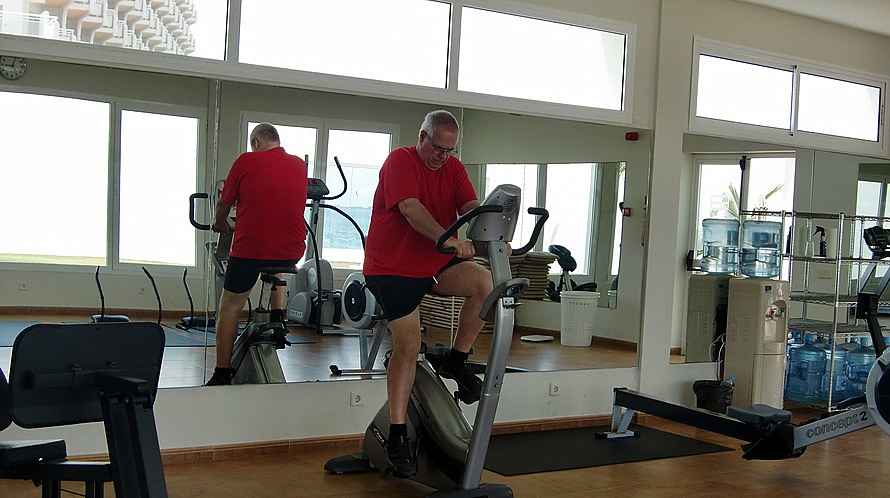 Der Wind weht heftig und ohne Sonne ist es bei etwa 22 Grad doch recht frisch hier draußen, so kehren nach etwa 2 Stunden wieder ins Hotel zurück. In der Poolbar genießen wir jeder noch einen Kaffee. Kaum sind wir auf dem Zimmer zurück, reißt der Himmel erneut auf und die Sonne scheint wieder. Was für ein verrückter Wetterverlauf. Ich schwinge mich wieder auf das Ergometer um einige der Kalorien, die mich am Büffet wieder anlächeln werden, schon im Vorfeld zu vernichten.