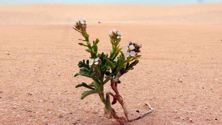 Wir finden erstaunlicherweise sehr viel flachen, bzw. strauchartigen Bewuchs im Dünengebiet und sogar eine einzelne ganz kleine blühende Pflanze. Es macht Spaß, die teilweise recht steilen Dünen hinab zu rutschen, auch aufwärts geht es erstaunlich leicht. Die Dünen sind oft sehr fest. Interes- santerweise finden wir hier in den Dünen sehr viele kleine Muscheln bzw. Muschelteile oder Schneckenhäuser, während am Strand kaum etwas davon zu finden ist. Leider hat sich der Himmel kurz nach unserem Aufbruch zur Wanderung wieder total zugezogen. Wir wandern aber unverdrossen weiter.
