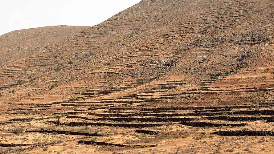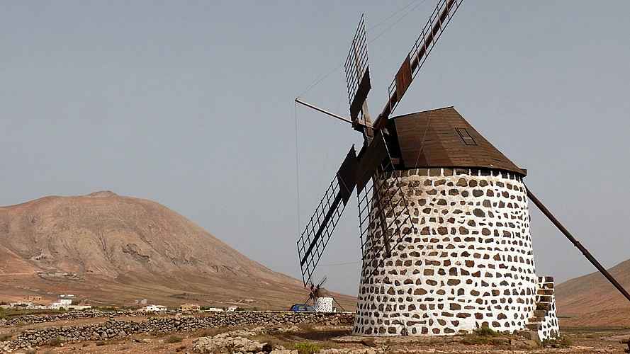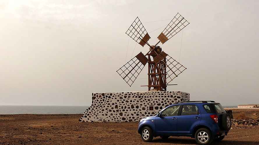 Vorbei an Puerto del Rosario fahren wir dann ins Landesinnere nach Tetir. Es folgt ein kurzer Besuch der kleinen Kirche Iglesia de Santo Domingo de Guzman in Tetir. Auch in Tetir steht eine „weibliche“ Windmühle, diesmal allerdings mit 6 statt 4 Flügeln. Schon von hier aus sieht man auch den Berg Temejereque mit seinen hohen Funkantennen auf der Spitze des Berges. Über eine Schotterpiste, die man auf keinen Fall mit einem normalen PKW befahren sollte, fahren wir bis auf das Plateau bei 545 m Höhe hinauf. Von hier oben hat man einen sehr schönen aber windigen Rundblick in die Land- schaft bis hinunter nach Puerto del Rosario und in alle anderen Richtungen.