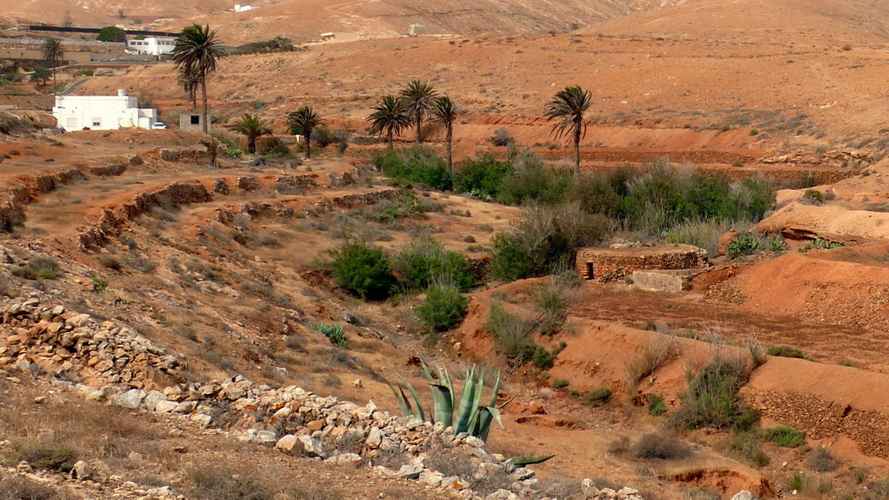 Wir verlassen diese öde Ecke und fahren nach Valle de Santa Ines. Dort suchen wir zunächst „La Casa de Queso“, hier soll es selbst gemachten Ziegenkäse geben, finden es aber nicht. Dafür gibt es hier sehr schöne Fotomotive, man muss einfach nur mal durch den Ort fahren. Etliche alte Terrassenfelder liegen in und um den Ort herum und sehr viele alte Palmen stehen in der Gegend. Mir hat dieser Ort gut gefallen. Auf dem Weg nach Betancuria an der Küste durchqueren wir auch die Berge. Die Straße windet sich teilweise serpentinenartig hinauf bis auf eine Höhe von etwa 600 m.
