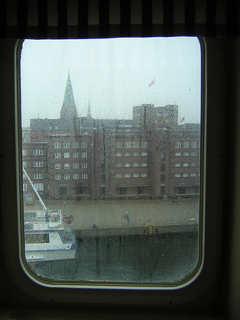 Gegen 7 Uhr gehen wir zum Büffetrestaurant und genehmigen uns für 9 Euro pro Person das Frühstücksbüffet. Es ist wieder alles da, was das Herz begehrt (siehe Hinfahrt). In der Kabine packe ich unsere Sachen zusammen und drehe anschließend noch eine Runde auf Deck 10, es regnet. Elke will noch ein wenig in einem Buch lesen. Bis zum Anlegen bleiben wir dann noch in der Kabine und gehen dann mit unserem Gepäck hinunter auf Deck 7, wo sich der Ausgang befindet.