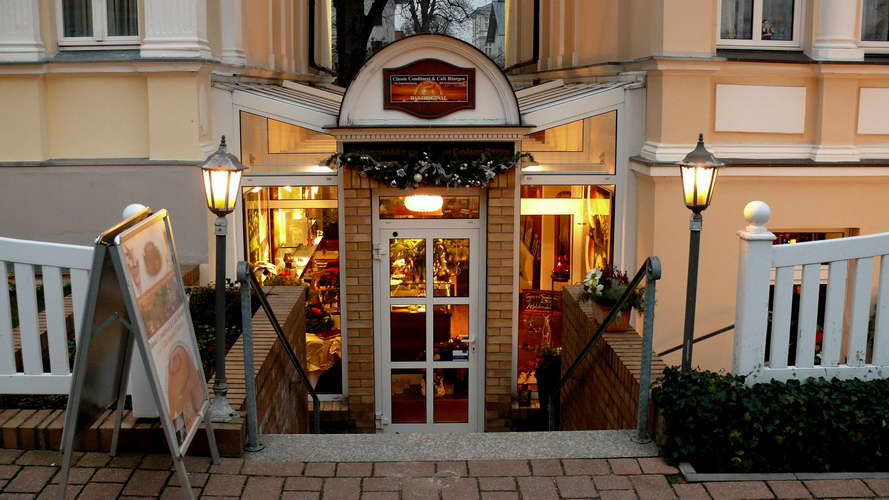 Auf einer Werbetafel haben wir auf unserem Weg einen Hinweis auf ein Café gesehen, in dem wir uns jetzt doch noch Kaffee und Kuchen schmecken lassen wollen. Ahlbeck ist zwar das größte der 3 Seebäder, aber die Wege sind doch recht kurz. So stehen wir einige Minuten später vor dem Café Röntgen in der Bismarckstraße 1 in der Villa Auguste Viktoria.
