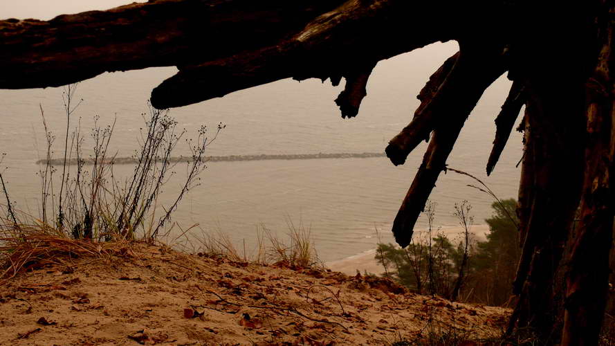 Weiter geht die Fahrt bei immer noch neblig-trübem Wetter zum Kölpinsee. Dieser liegt direkt hinter den Dünen der Ostseeküste ganz in der Nähe des Ortes Loddin. Hier finden wir einen kostenlosen Parkplatz und spazieren erst mal wieder zum Strand. Ein großes Hotel steht hier direkt an der Küste mit schönem Blick sowohl auf die Ostsee als auch den 35 ha großen Kölpinsee.