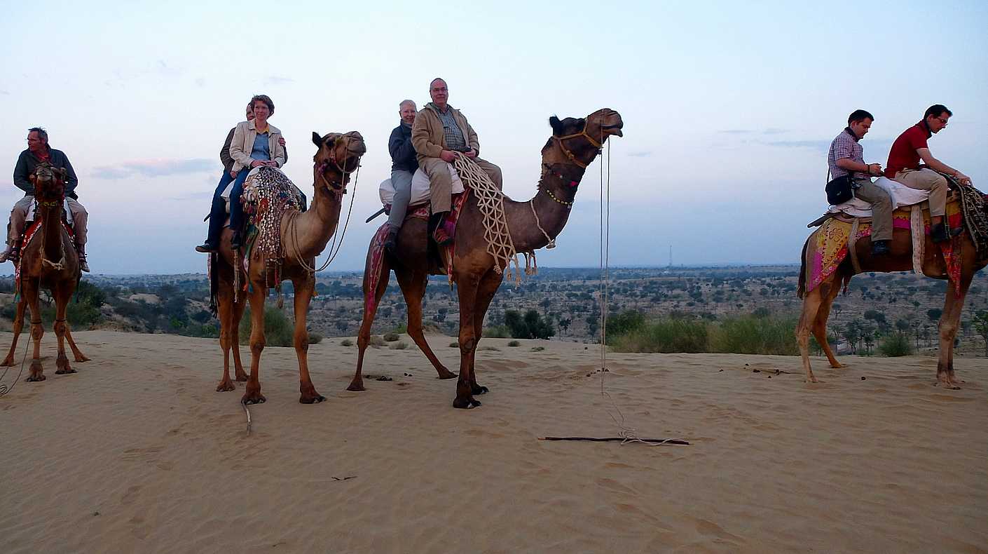 Im gemütlichen Tempo trabt die Karawane zum Campausgang und dann weiter durch die Wüste Thar, die hier eher eine Halbwüste ist, zu den Dünen. Jedes Dromedar wird von einem Einheimischen begleitet, zur Sicherheit der Dromedare und der Touristen. Langsam steigt das Dromedar die Düne hinauf und nach ca. 25 Minuten sind wir oben angelangt. Die ganze Angelegenheit ist etwas wackelig, aber es ist nicht mein erster Dromedarritt, daher kein Problem. Bei Elke war es das erste Mal, aber sie hat sich gut gehalten.