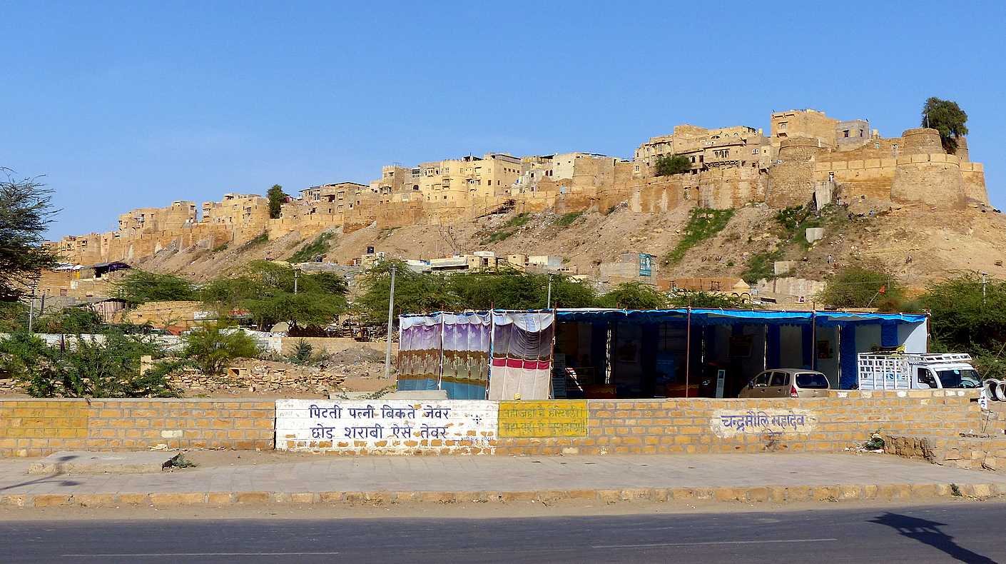 Gegen 13 Uhr 30 verlassen wir das Resort und fahren nach Jaisalmer. Mücken haben wir übrigens bisher auf der gesamten Fahrt nur eine einzige erlebt. Trotzdem schmieren wir uns abends immer ein, wenn wir zum Essen ins Freie gehen. Unterwegs legen wir noch einen kurzen Stopp ein, für die Befreiungshalle, wie unser Reiseleiter sie nennt, wir kennen dass als Toilette. An einer Bahnschranke zählt Elke an einem vorbeifahrenden Güterzug 60 Waggons, auch die Personenzüge sind in Indien sehr lang.
