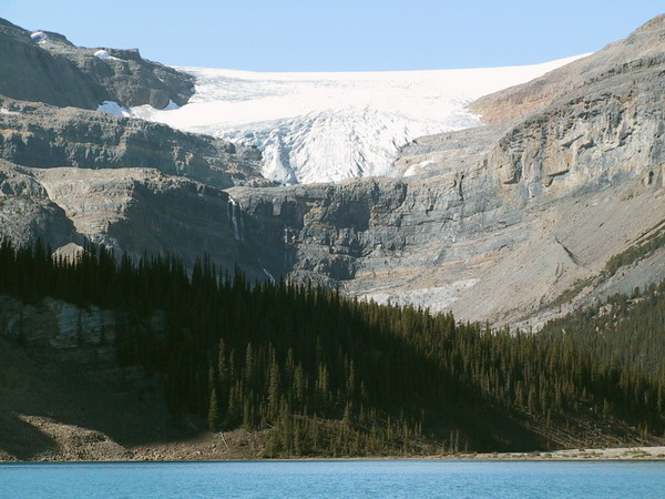 Bei etwa Km 16 (ab Beginn des Icefield Parkway) erscheint links von uns der Bow Lake. Wunderschöne Wasserfarbe, relativ gross und schneebedeckte Berge im Hintergrund. Wunderschön gelegen, von 2 verschiedenen Stellen aus konnten wir den See fotografieren und filmen. Auch hier waren schon sehr viele Leute (wieder sehr viele Asiaten) unterwegs.
