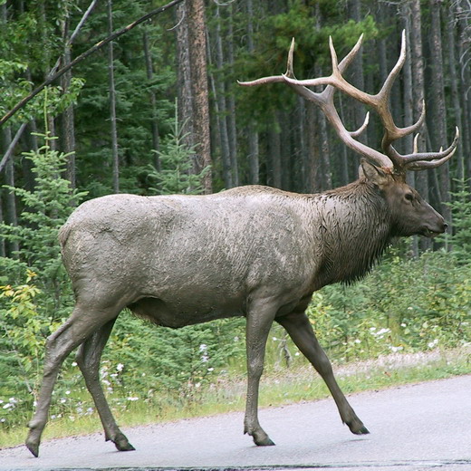 Sobald sich der gewaltige Hirsch erhob zogen sich viele Fotografen gleich ein Stück zurück. Diese Wapitis sollen sehr schnell auf den Hufen sein. Dieser aber legte sich wieder hin, wühlte noch ein bisschen den Schlamm auf und trabte dann quer über die Strasse durch die wartenden Autos auf die andere Seite.