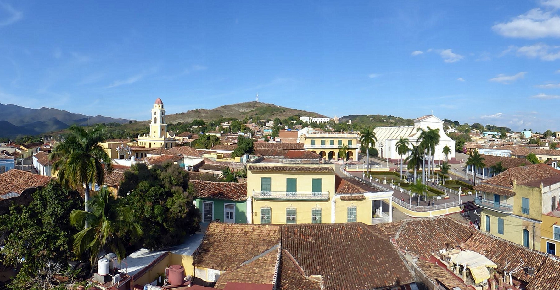 Wir lassen wir uns noch einen Augenblick im Restaurant Doña Clara nieder bis der Rest der Gruppe mit seinem Mittagsessen fertig ist und alles bezahlt hat. Anschließend gehen wir zum Palacio Cantero, einem der größten und eindrucksvollsten Häuser in Trinidad. Es wurde im klassizistischen Stil im Jahre 1828 von Don Jose Mariano Borrell y Padron erbaut, einem der reichsten Männer Trinidads. Das Haus verfügt über eine geräumige, große Eingangshalle, die sich zu einem großen Innenhof öffnet. Es besitzt eine interessante Innenausstattung, schöne Wandmalereien und Fresken. Von einem Turm aus, den ich besteige, ergeben sich fantastische Ausblicke auf die Plaza Mayor, die Stadt Trinidad, und das Meer. Trinidad liegt unter mir wie ein großes Freilichtmuseum. Elke ist lieber unten geblieben. Für die Fotoerlaubnis im Gebäude müssen wir 5 CUC bezahlen. Gilt immer für eine Person.