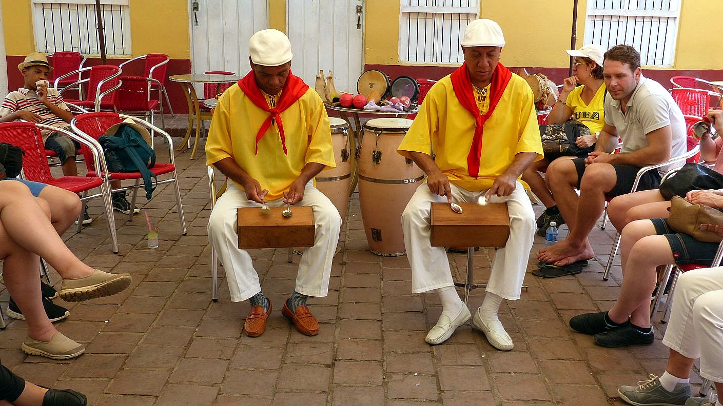 Über einen kleinen Markt mit Souvenirartikeln erreichen wir die "Casa de la Trova", frei übersetzt das Haus der Troubadoure. Schon am Vormittag wird hier im Stil des Buena Vista Social Club musiziert und alle Tische im Innenhof sind gut gefüllt. Wir hören eine Weile zu und gehen dann weiter zur einer Treppe kurz vor der Plaza Mayor. Sie führt uns hinauf zum "Casa de la Musica". Hier bekommen wir von 2 Kubanern eine ausführliche Einführung in kubanische "Trommeln, Rasseln und ähnliche Musikinstrumente", ihre Herstellung und wie sie eingesetzt werden. Einige Mitreisende dürfen sich aktiv daran beteiligen.