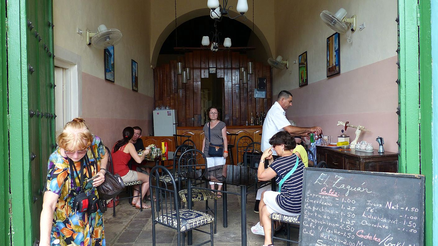 Zum Mittagessen kehrt die Gruppe in das Lokal Doña Clara ein. Wir wollen mittags nicht schon wieder ein großes Menü essen, da wir sehr gut gefrühstückt haben. Maribel empfiehlt uns daher ein anderes kleines Lokal (Tapas-Bar), wo wir auch eine Kleinigkeit essen können. Wir gehen aber erst mit der Gruppe mit, da Studiosus einen kostenlosen Drink im Doña Clara, einen Canchanchara spendiert, der sehr lecker schmeckt. Dieses Getränk besteht (in der Regel) aus 1 Halm Zitronengras, 2 TL Honig, 2 TL Puderzucker, 1 TL Limettensaft, 6 cl Havana Club (Rum), gestoßenes Eis, 1 Limettenscheibe. Anschließend spazieren wir zurück zur Plaza Mayor und lassen uns dort im Lokal El Zaguán mit gerade mal 12 Plätzen nieder. Wir erwischen den vordersten der 3 Tische, sehr luftig und gut zum Leute beobachten.