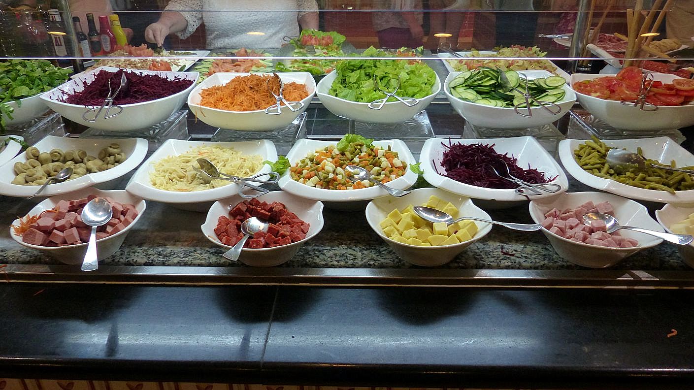 Gegen 18 Uhr 30 machen wir uns fertig und gehen zum Abendessen. Wir nehmen heute einen Tisch in einem Seitentrakt des großen Restaurants. Dieser Bereich ist kleiner und nicht so wuselig, daher ist hier der Lärmpegel deutlich niedriger. Zum Abendessen ist eigentlich genau das gleiche zu sagen wie zum Frühstück. Organisatorisch ist es fast unmöglich für alle frisch gebratenen Fleischstücke bei soviel Menschen nur eine Station anzubieten, die die Stücke brät. Das war in Santiago besser gelöst. Es gibt aber trotzdem sehr viel Leckeres zu essen.