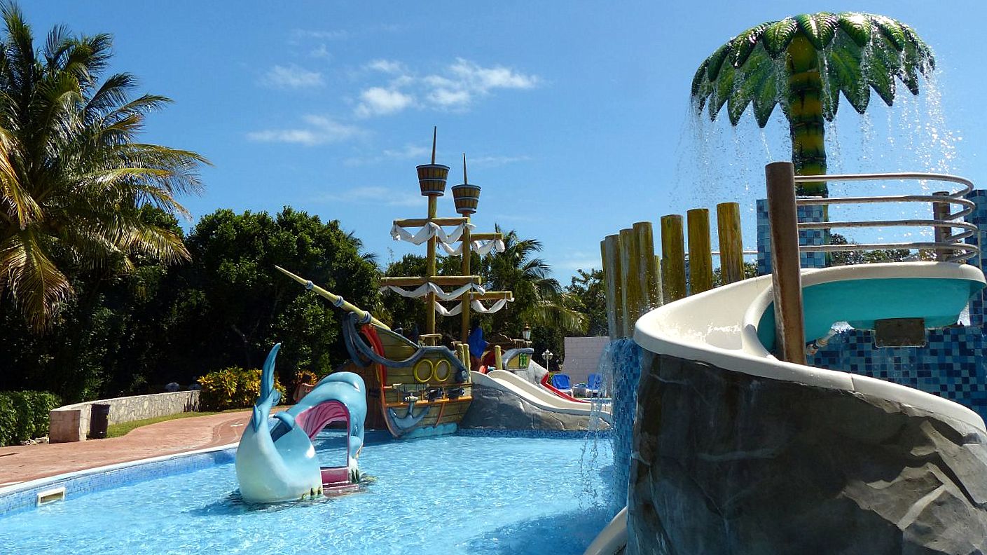 Auf dem Weg zur Zona Oeste Park, die fast spiegelbildlich zur Zona Oeste Spa angelegt wurde, entdecken wir noch die Sportanlagen des Hotels. In der Lobby legen wir eine kurze Pause ein. Da es sich hier im Hotel um ein All-Inklusive-Angebot handelt, kann man sich die Getränke nach Herzenslust bestellen. Elke nimmt eine Limonade, ich eine Pina Colada. Anschließend erkunden wir die Zona Oeste Park. Sie besitzt eine Besonderheit, den Aquapark für Kinder. Es wurde ein Piratenschiff installiert und noch einiges mehr für die Kinder. Daran schließt sich die uns noch schon bekannte Poollandschaft mit der Poolbar an. Einige wenige Touristen sehen wir beim Aquafitnesstraining. Den ganzen Tag über finden irgendwelche Veranstaltungen und Trainingsprogramme statt. Das Programm, auch für die Abendveranstaltungen hängen in der Nähe der Rezeption aus.
