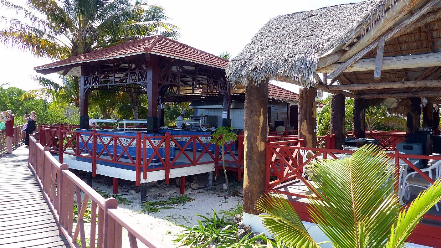 Von der Zona Oeste Park gehen wir auf einem weiteren Steg wieder durch die Mangroven hinunter zum Strand. Hier treffen wir auf einige aus unserer Reisegruppe und unterhalten uns eine Weile mit Ihnen. Dann laufen wir am Strand entlang bis zur Ensenachos Beach Bar, wo mittags auch ein Buffet aufgebaut wird. Dort treffen wir auf Dieter und Anita. Wir quatschen noch eine Weile zusammen und bedienen uns am Buffet, dann gehen die Beiden wieder ihre eigenen Wege und wir sitzen noch eine Weile dort und genießen den Blick aufs Meer. Genau zu diesem Zeitpunkt trifft die Gruppe zum Essen ein mit denen wir vorher schon mal geplauscht hatten. Also bleiben wir auch noch eine Weile und ich gönne mir noch einen Pina Colada. Mindestens 2 Finger breit (bei einem ansonsten kleinen Becher) ist hier der Rumanteil, ein kräftiges Getränk.