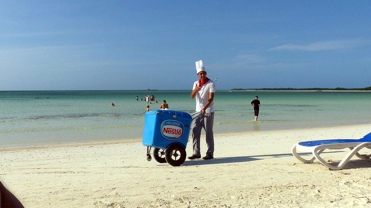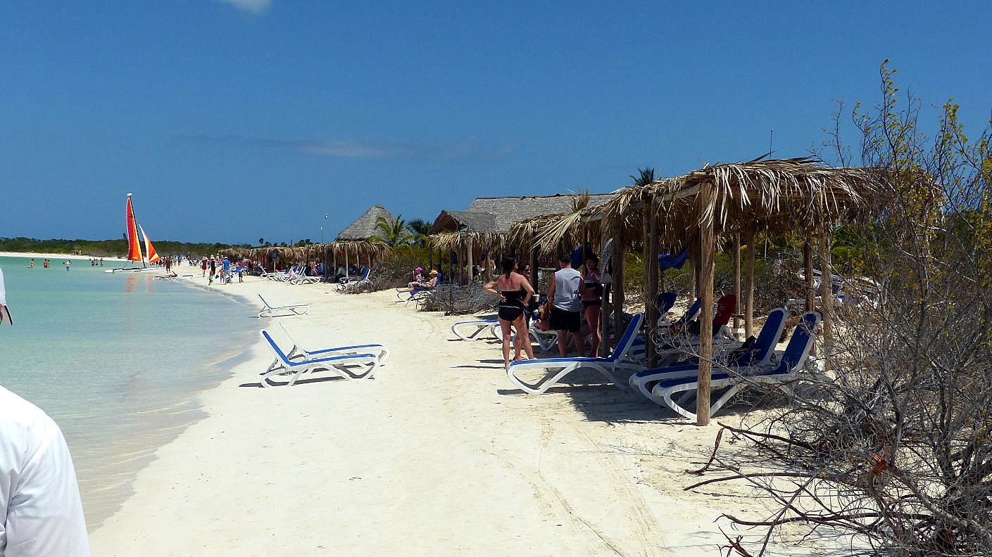 Später ziehen wir uns wegen der Mittagshitze auf unser Zimmer zurück und ich schreibe schon mal den Reisebericht des gestrigen Tages. Gegen 15 Uhr machen wir uns erneut auf den Weg Richtung Strand und finden tatsächlich 2 freie Liegen unter den Palmendächern der kleinen Strandhütten. Noch während wir unsere Handtücher ausbreiten, erscheint zu unserer Überraschung ein Mann, der einen Eiswagen über den Strand schiebt und kostenlos Eis an alle Badegäste verteilt, was für ein Service. Wir sind ziemlich überrascht. Dann gehen wir ins Wasser. Da es sich hier auch um den Golf von Mexiko handelt liegt die Wassertemperatur ähnlich "niedrig" (24-25 Grad) wie in Cayo Levisa. Wir klappern uns ins Wasser, wozu man aber erst mal mindestens 100 m ins Meer laufen muss, damit wenigstens die Knie bedeckt sind. Um richtig zu schwimmen zu können, muss man wesentlich weiter hinauslaufen. Zum Abduschen stehen in der Nähe der Strandbar 2 Duschen bereit.