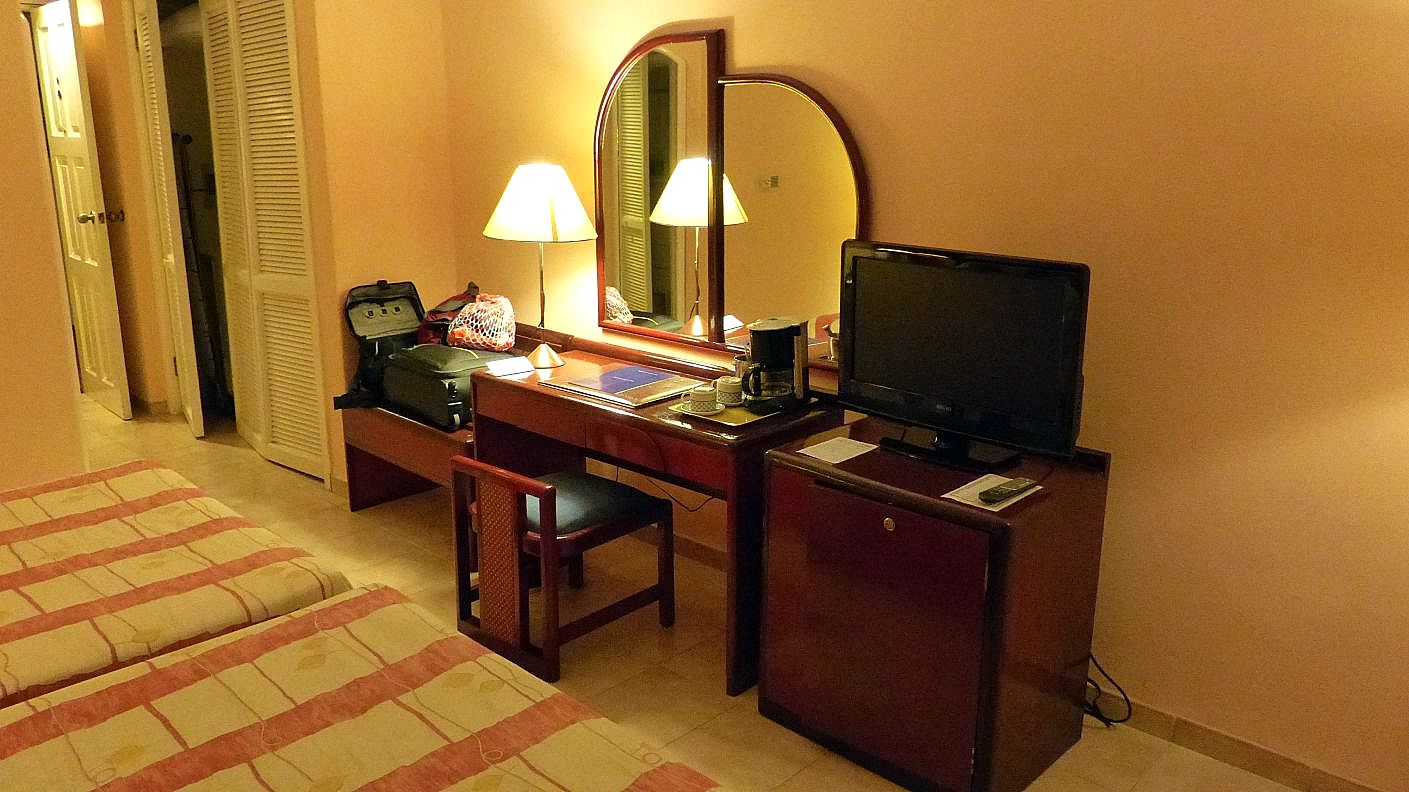 Das Zimmer ist zweckmäßig eingerichtet, ein Schrank im Eingangsbereich mit Safe (Schlüssel gegen Gebühr, 2 CUC pro Tag). Ein Bad mit Dusche und Waschbecken, Haarshampoo und Duschgel, Handtücher und Toilettenpapier. Bei einigen Mitreisenden fehlten die Toilettenbrillen und bei uns hatte der Ablauf des Waschbeckens eine undichte Stelle. An einem Morgen gab es kein warm Wasser. Im Zimmer gibt es 2 Betten (etwas weich), einen Schreibtisch mit TV und eine Minibar, die Klimaanlage ist abschaltbar, zum Zimmer gehört auch ein Balkon mit schöner Aussicht.