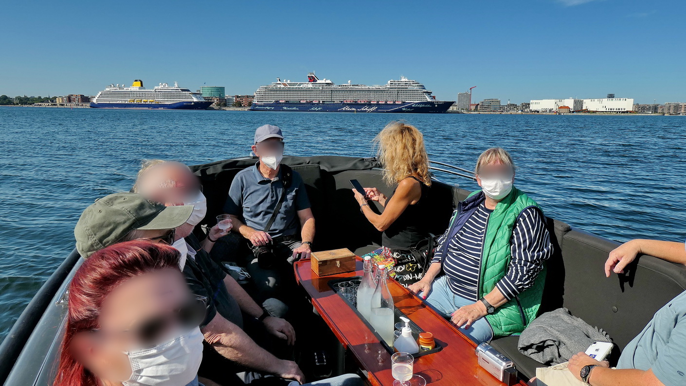 Jetzt geht es Richtung Norden entlang der Halbinsel Refshaleøen. Der ehemalige Industriestand- und Werftstandort hat sich heute deutlich gewandelt. Flohmärkte, Kulturleben und Gastronomie haben sich hier etabliert und viele Firmen angesiedelt. Bei der weiteren Fahrt bei strahlendem Sonnenschein kommen wir auch an der "Mein Schiff 1" vorbei und können schöne Fotos schießen. Inzwischen hat hinter unserem Schiff auch die "Spirit of Adventure" festgemacht, ein Neubau einer britischen Reederei, welches coronabedingt erst auf seiner 3.Kreuzfahrt ist.