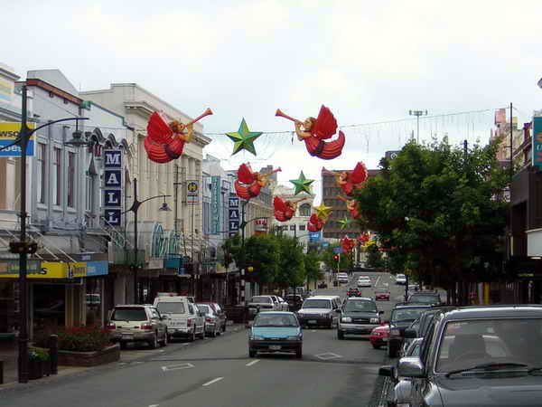 Da der Regen inzwischen ganz aufgehört hatte, spazierten wir noch ein bisschen durch die Hauptstraße von Timaru, wo erstaunlicherweise heute am Sonntag doch einige Läden offen hatten. Wir konnten aber nicht viel Kundschaft entdecken. Die normalen Geschäfte schließen in Neuseeland wochentags gegen 17 Uhr 30, langer Donnerstag ist bis 20 Uhr!!! geöffnet. Sonntags sind die meisten Läden zu. Um überhaupt ein Foto des Tages zu haben, schossen wir eine Aufnahme in der etwas weihnachtlich geschmückten Einkausfsmeile von Timaru. Auf der ganzen Strecke heute war nicht ein einziges Fotomotiv, was sich trotz des Regens gelohnt hätte.