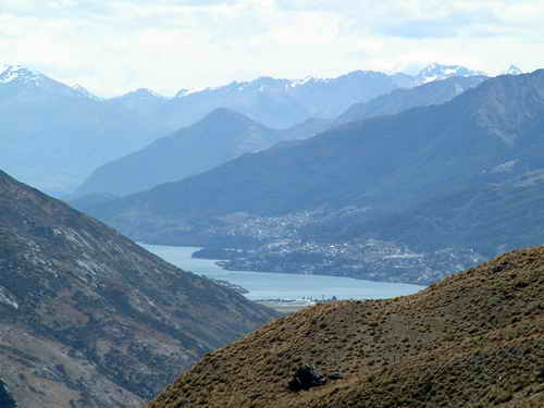 Von hier hat man einen schönen Blick voraus auf Queenstown und Teile des Lake Wakatipu. Hinter sich sah man die total kahlen Hänge der Berge, bis auf die überall vorhandenen Büschel von Tussock-Gras, ungenießbar für alle Tiere.