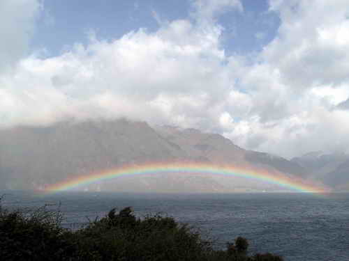 Das Wetter war sehr wechselhaft auf unserem Weg. Entlang des Lake Wakatipu auf dem SH 6 ging es Richtung Süden bei viel Regen und einem ganz phantastischen Regenbogen.