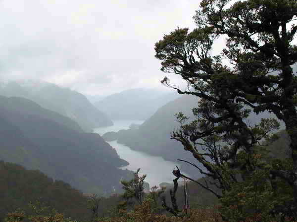 Wir checkten also ein und bekamen unseren Boarding Pass. Um 12 Uhr 30 verließen wir bei Sonnenschein die Anlegestelle und fuhren über den Lake Manapouri bis zum anderen Ende des Sees (50 Min Fahrzeit). Hier dauerte es einen Augenblick und dann ging es per Bus weiter (es besteht keine direkte Verbindung zwischen dem See und dem Sound). Der Bus klettert dann von Meereshöhe auf ca. 750 m und auf der Passhöhe erfolgt dann der obligatorische Fotostopp für den Doubtful Sound. Leider waren hier sehr viele Wolken, so dass wir den Sound nur etwas nebelhaft wahrnehmen konnten. Aber schon die vielen Wasserfälle auf dem Weg nach hier oben und die bemoosten Bäumen ließen uns erahnen was uns erwarten würde. Es sieht hier ein bisschen aus wie im Zauberwald.