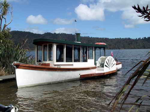 Wir erfuhren, dass der Besitzer dieses 102 Jahre alten Gefährts diesen am Lake Taupo entdeckt hatte. Er befand sich damals in einem erbärmlichen Zustand. In etwa einem Jahr hat er persönlich das Schmuckstück wieder restauriert. Aus optischen Gründen wurde die alte Schraube durch 2 Schaufeln rechts und links ersetzt was diesen netten Dampfer optisch sehr aufwertet ,der auch für flaches Wasser (Tiefgang nur 50 cm) geeignet ist.
