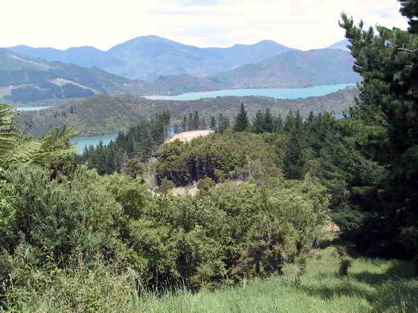 Nach dem Frühstück holten wir noch unser Lunchpaket ab und bereiteten uns für eine Wanderung vor. Wir hatten uns gestern Abend noch einige Tips für den heutigen Weg geben lassen. Zunächst marschierten wir 2 Kilometer auf der Schotterpiste, bis wir schließlich den eigentlichen Wanderweg erreichten. Entlang der Küstenlinie, mit vielen Ausblicken auf die gegenüberliegende Seite des Sounds, marschierten wir auf fast ebener Strecke immer entlang der sich windenden Küstenlinie. Zum Teil gab es wunderschöne Ausblicke auf den Kenepuru Sound.