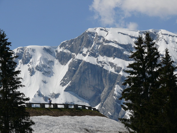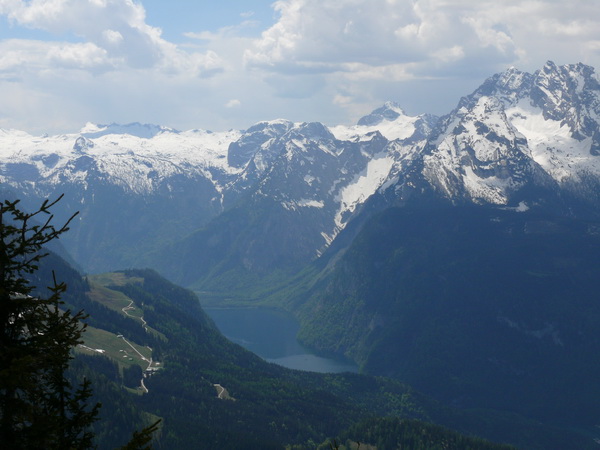 Wir unternehmen dann einen ausgiebigen Rundgang auf den zugänglichen Wegen rund um das Haus. Der Schnee liegt hier oben noch ca. 2-3 m hoch. Wie wir später erfahren, wurde die Terrasse extra zum Pfingstgeschäft mühsam freigeschaufelt, sonst wäre das Haus noch immer wegen der Schneemassen geschlossen.Sowohl zum Königssee als auch ins Salzburger Land ergeben sich herrliche Ausblicke bei bestem Sonnenschein. Allerdings ziehen von Westen deutlich kompaktere Wolken heute auf als an den letzten Tagen.