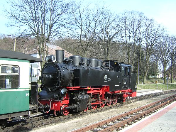 Nach einem ausgiebigen Frühstück fuhren wir mit der so genannten Bäderbahn (ein kleiner Bus mit Anhängern, Elektromotor) kostenlos dank Kurkarte zum Kleinbahnhof Binz. Ich kaufte 3 Fahrkarten nach Baabe (je 3,20 Euro) und wir warteten gespannt auf die Ankunft des "Rasenden Roland". Diese Kleinbahn (Spurweite 750 mm) ist ein ganz tolles Gefährt. Mehrere verschieden große Dampfloks sind hier im Einsatz und ziehen teilweise recht alte aber restaurierte Wagen zwischen Putbus und Göhren. Der "Rasende Roland" ist wirklich eine der Attraktionen auf Rügen. Besonders im Winter, wenn alles mit Dampf beheizt wird, ergeben sich gespenstische Szenen, sobald der Zug irgendwo hält, alles wird in Dampf eingehüllt.