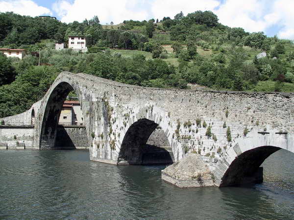 Wir beschließen daher auf die schöne Aussicht zu verzichten und nehmen direkten Kurs auf Borgo a Mozzano. Hier befindet sich in der Nähe des Ortes die Ponte della Maddalena, auch Ponte de Diavolo genannt, eine schöne mittelalterliche Brücke von 1670. Zu erreichen über die SS 12 auf der Ostseite am Serchiofluß entlang. Sobald der Abzweig kurz vor Borgo a Mozzano zum Ort nach links über den Fluss weist, fährt man aber geradeaus weiter und sieht kurz darauf dann auch die Brücke. Hier auf dieser Seite des Flusses sind Parkplätze vorhanden und für die Fotografen ist es der eindeutig bessere Standort. Genau im dem Augenblick als wir ankommen, erscheint auch die Sonne. Die Brücke ist wirklich sehenswert. Sie ist eindeutig höher als sie auf Fotos aussieht. Nachdem wir etliche Bilder geschossen haben, besteigen wir die Brücke. Vom Scheitelpunkt haben wir eine wunderbare Aussicht in die Umgebung, hohe waldbedeckte Berge und der Fluss Serchio. Wir genießen die Aussicht eine ganze Weile und gehen dann wieder zurück zum Auto. Gerade als wir es uns im Auto gemütlich gemacht haben, setzt draußen wieder der Regen ein und etliche Besucher verlassen im Galopp die Brücke.