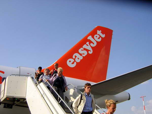 Nach etwa 5 Minuten Wartezeit stoppt der Shuttlebus vor dem schattenspendenden Unterstand und bringt mich und andere Mietwagenfahrer zurück zur Haupthalle. Elke und Gitti finde ich kurze Zeit später im Abfertigungsbereich A wieder. Wir haben noch über eine Stunde bis zum Check-In und finden zum Glück auch bald eine Sitzgelegenheit. Um 13 Uhr 25, genau 2 Stunden vor dem Abflug soll das Check-In beginnen. Kurz vorher, ich sehe mich gerade mal wieder in der Halle um, entdecke ich plötzlich an 2 Schaltern das Logo von EasyJet. Wir schnappen uns sofort unsere Sachen und begeben uns schnellstens zu diesen Schaltern. Und tatsächlich, obwohl auf den Bildschirmen noch nicht angekündigt, beginnt bereits die Abfertigung. Wir sind die Passagiere 6-8, die einchecken, ohne Gedrängel und Wartezeit